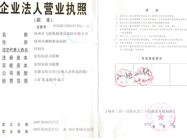 林州市飛躍鐵路道岔器材有限公司位于舉世聞名的世界八大奇跡之一“人工天河”紅旗渠畔,晉、冀、豫三省交界處,交通、通訊便捷。 公司擁有職工和管理人員120多人,高工5名,技術(shù)人員23人。擁有先進(jìn)的鑄造機(jī)加工設(shè)備和完整的質(zhì)量檢測(cè)體系,使我公司連續(xù)數(shù)年被評(píng)為“重合同守信用”和“重量管理”先進(jìn)單位。公司生產(chǎn)的主要產(chǎn)品有:輕重軌道岔及各種工具。按種類區(qū)分有:?jiǎn)伍_(kāi)道岔、對(duì)稱道岔、三開(kāi)道岔、渡交組合道岔等。特殊要